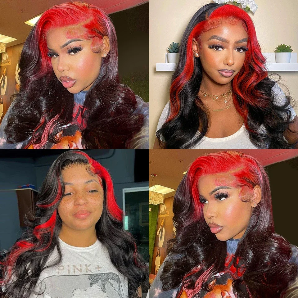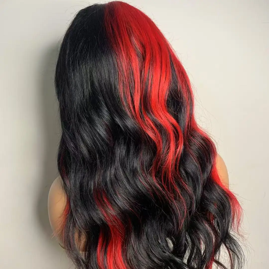 Color: Highlight Red With Black Colored Human Hair Lace Frontal Closure Wigs