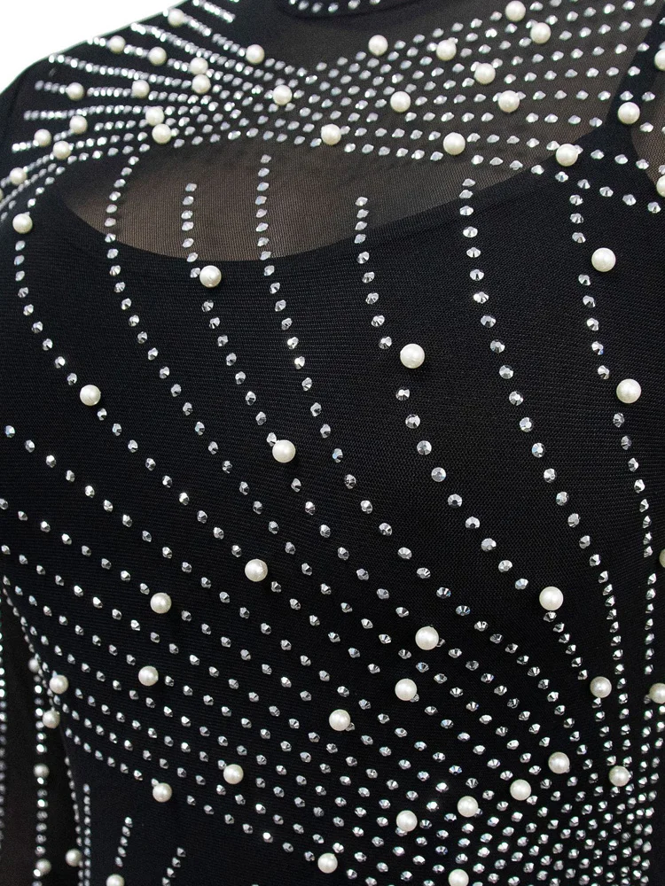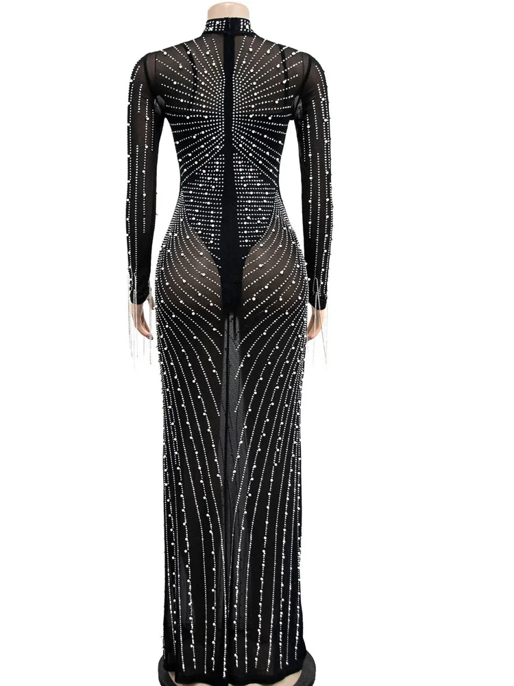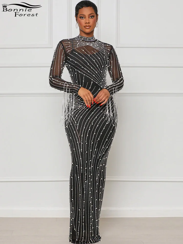 Luxury Woman Party Dress Glam Long Sleeve Pearls Rhinestone Fringed Evening Dress Gowns Celebrities Outfits
